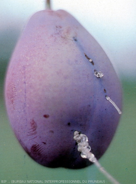 Les fruits attaqués présentent des galeries superficielles. Des écoulements gommeux caractéristiques peuvent alors être observés. Ils correspondent à une défense naturelle des fruits. Avec un peu d'attention, et à l'aide d'une loupe, il est possible d'observer une trace d'oeuf à proximité de la perforation.