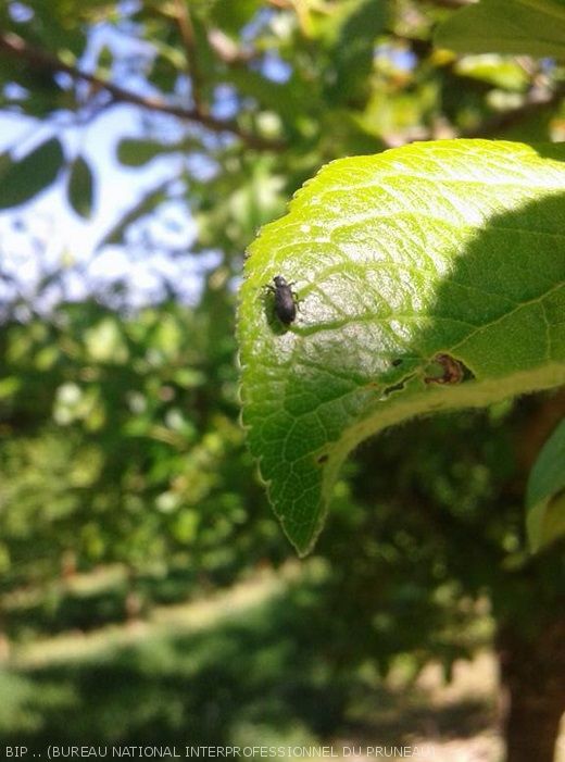 L'extrémité des jeunes pousses est coupée. Les dégâts seront donc très facilement visibles sur jeunes vergers. D'autres coléoptères peuvent manger les feuillles et provoquer des symptômes de feuilles "découpées" : les péritèles gris, les otiorhynques, les phyllobes.