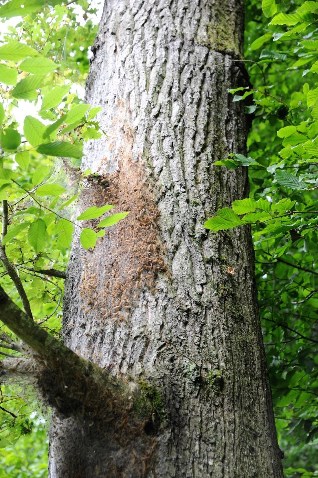 Durant les deux premiers stades, elles restent à l’endroit de la ponte, où elles se nourrissent des jeunes feuilles de chêne venant de débourrer (cf. figure 5). A ce moment, elles ne sont pas urticantes. A partir du 3ème stade larvaire, elles deviennent plus mobiles, et se mettent à tisser de véritables nids dans lesquelles elles s’abriteront le jour et qu’elles quitteront la nuit en procession pour aller se nourrir (cf. figure 6).