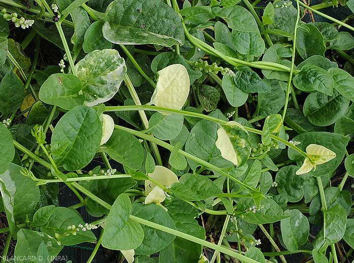 - décolorations foliaires affectant une à plusieurs feuilles : des secteurs contigus jaunes à blancs, plus ou moins bien étendus, sont visibles sur le limbe (figure 1) ;