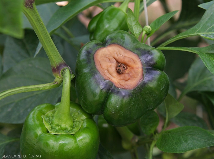 • lésions humides apparaissant à l'extrémité des fruits, au niveau ou à proximité de l'attache pistillaire. Diffuses dans un premier temps, elles brunissent et s'étendent progressivement par la suite (figure 1).