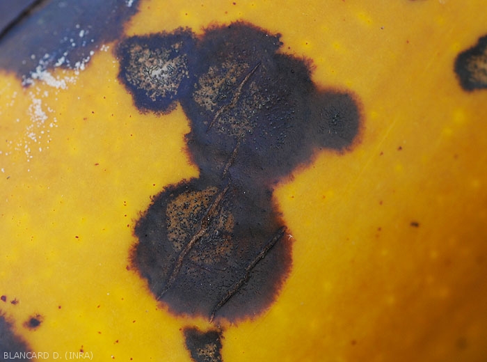 Taches circulaires humides s'étendant, brunissant et noircissant progressivement sur les fruits au fur et à mesure de leur maturation (figures 6 et 7). Les taches sont légèrement concaves et peuvent coalescer, et provoquer une pourriture de secteurs importants des fruits (figure 7), voire les dégrader entièrement. Altération des graines qui prennent une teinte rouille.