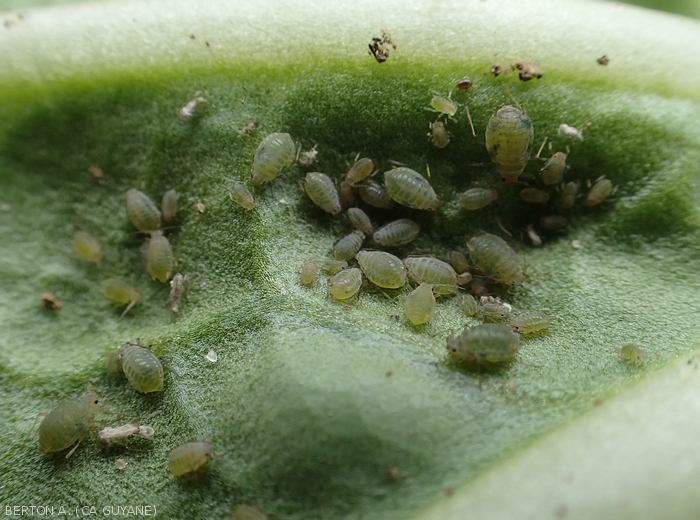 Pucerons localisés généralement à la face inférieure des feuilles, sur les deux faces des feuilles de chou en cas de pullulation