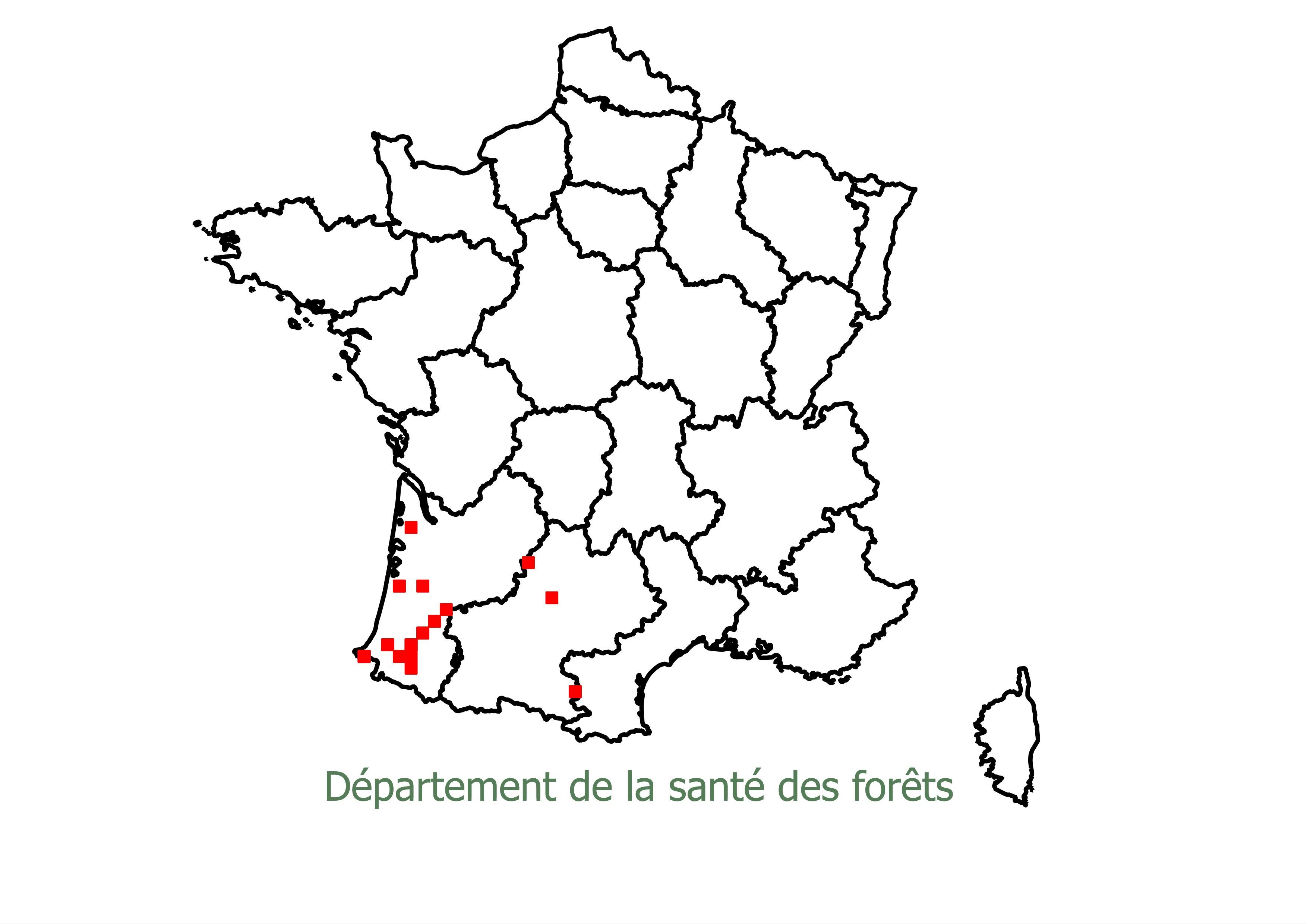 La maladie des tâches brunes est due à un champignon d’origine nord américaine qui nécessite humidité et chaleur pour germer. Ce champignon a été observé en France pour la première fois en 1993 dans les Landes et les Pyrénéens-Atlantiques, essentiellement sur l’hybride pinus attenuata x pinus radiata (parrticulièrement sensible) et sur le pin radiata. La forte sensibilité de l’hybride pinus attenuata x pinus radiata a déclenché son éradication de manière à éviter une éventuelle installation du pathogène sur les pins autochtones, en particulier les pins maritimes. La maladie est restée depuis très localisée dans les Landes et les Pyrénées-Atlantiques.
