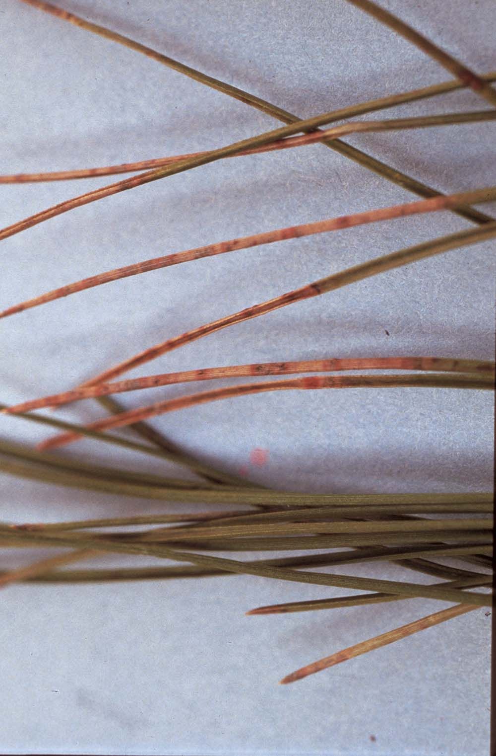 Des taches brunes de 1 à 2 mm, bordées de jaune, se développent au printemps sur les aiguilles vertes d’une à plusieurs années; plus tard, des fructifications noires se forment au centre (figure 1). Les aiguilles infectées brunissent et tombent prématurément. En mai, des symptômes évidents apparaissent sur les pins rampants et les pins à crochets (figure 2) dans les jardins et les parcs publics. En cas de forte attaque à des pins de montagne, il ne reste souvent que la dernière génération d’aiguilles qui viennent de bourgeonner (figure 3). Si les aiguilles atteintes tombent deux mois plus tard environ, les pins touchés par cette infection ne se remarquent presque plus. Seules les branches partiellement défoliées portent encore les traces d’une éventuelle maladie.
