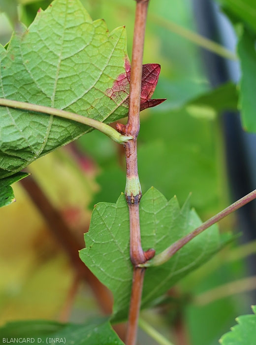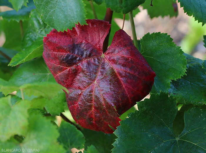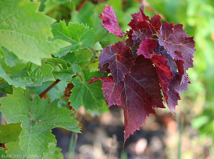 Les dommages ne sont pas graves sur ceps adultes mais sont assez spectaculaires à l'automne (photos). A noter que quand des jeunes rameaux sont touchés, ceux-ci peuvent se dessécher complétement, surtout sur jeunes vignes.