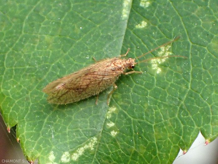 Les adultes des Hemerobidae sont de couleur brune, avec des ailes souvent ornées de taches plus sombres. Leur envergure est d'environ 15 mm (figure 7). Les oeufs sont blanchätres mais sans pédoncule et fixés seuls ou par petits groupes.