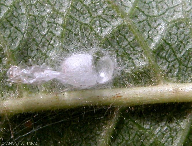 Les pontes de chrysopes sont caractéristiques, avec des oeufs blancs, ovoïdes placés à l'extrémité d'un long filament (figure 2).