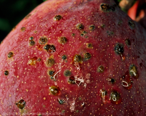 - Sur les fruits : provoque la nécrose des lenticelles et des stomates. Ces nécroses évoluent en taches noires d'où suinte une gomme chargée de bactéries. Les fruits ne sont alors plus commercialisables.