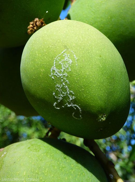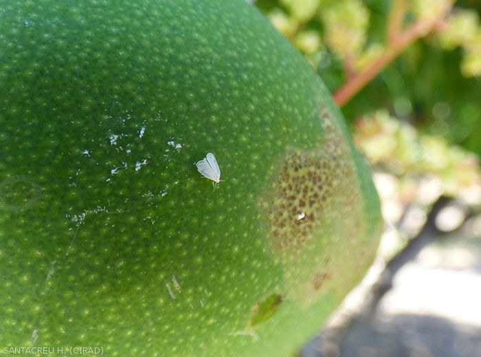 L'adulte forme des spirales lorsqu'il pond des œufs sur la face inférieure des feuilles ou sur les fruits.