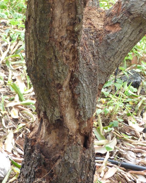 Les jacquiers, manguiers, arbres à pain, tamarins de l'Inde, avocatiers sont les espèces attaquées.