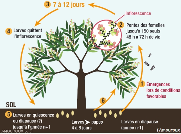 Les femelles pondent sur les inflorescences en débourrement ou directement sur les boutons floraux. Les larves pénètrent et forment des galeries dans les inflorescences. Au bout de 7 à 12 jours, les larves s’éjectent et tombent au sol où elles s’enfouissent. Une partie de celles-ci émerge en 7 à 10 jours et donne une nouvelle génération d’adultes, alors que l’autre partie reste dans le sol en diapause et émerge quelques semaines à plus d’une année plus tard.