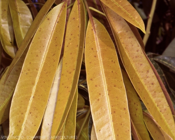 - Feuille : petites galles sphériques qui se recouvrent rapidement d'anthracnose, champignon très commun sur le manguier.