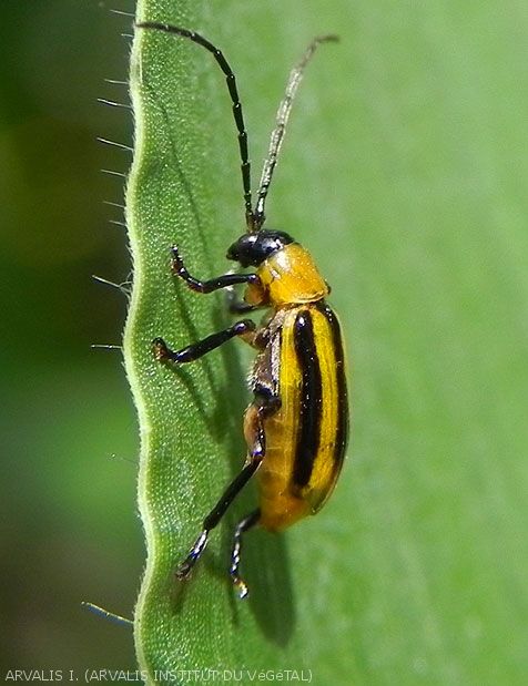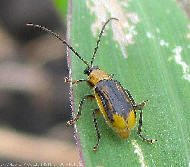 La chrysomèle du maïs est un coléoptère dont l’adulte mesure de 4 à 7 mm de long. Ses antennes sont presque aussi longues que le corps et les élytres présentent une alternance de bandes noires et jaunes. Ils peuvent être observés dans les parcelles de maïs au cours de l’été, à partir de début juillet et jusqu’à mi-septembre. L’adulte se nourrit de pollen et des soies du maïs. Il occasionne quelques dégâts sur les feuilles de maïs, généralement sans nuisibilité économique pour la culture.