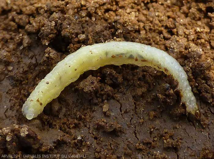 Les larves sont difficiles à observer au champ sauf dans le cas d’infestation très importante. Elles peuvent être observées dans les racines de maïs en mai et juin. Les larves sont molles, de couleur blanc crémeux et ont un corps cylindrique. Elles présentent à l’avant une capsule céphalique de couleur marron et à l’arrière une plaque anale marron foncé. Leur taille varie de 2-3 mm et jusqu’à 18 mm au troisième et dernier stade larvaire.