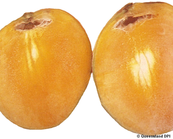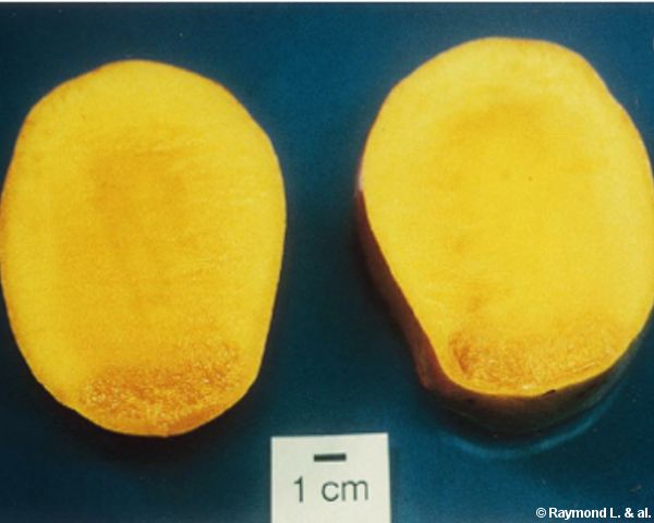 Ananas : "translucidité", cela correspond à la chaire qui mûrit plus vite que la peau (Figure n°1). Lors des périodes chaudes, les pluies intermittentes favorisent la sur-maturité du fruit. Les dégâts ne sont pas apparents à l'extérieur du fruit. Dans des cas sévères l'entièreté du fruit est touchée. Les fruits atteints de translucidité sont plus sensibles aux coups de soleil.
