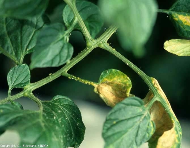 À la suite de leur prolifération sur les folioles, celles-ci se recroquevillent parfois (vous pouvez consulter la rubrique Taches à plage poudreuses, veloutées). Signalons que plusieurs d'entre eux sont d'efficaces vecteurs de plusieurs redoutables virus de la tomate.