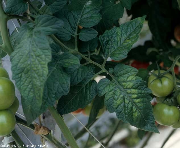 Marbrure chlorotique irrégulière, jaunissements internervaires en taches dans un premier temps, se généralisant par la suite à l'ensemble du limbe des feuilles basses. Ces dernières, les plus touchées, deviennent dures et cassantes.