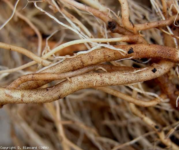 Il s'attaque au cortex de la racine, qui devient terne, brunit et se décompose progressivement dans le cas des cultures en sol (figures 1 et 2). En hors-sol, il a plutôt tendance à se décolorer et à se décomposer. Le cylindre central est parfois envahi ; il prend alors localement une teinte noire. Il produit dans le cortex des microsclérotes noirs qui signent sa présence sur les racines (figures 2 à 4). Ceux-ci sont parfois surmontés d'acervules disposant de soies brunes (figure 5) et produisant des conidies cylindriques . C'est pour cette raison que nous l'avons surtout détaillé dans le chapitre Autres altérations des racines.