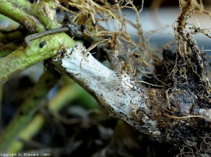 Les plantes malades ont généralement une répartition en foyers. Dans certaines zones particulièrement humides, le mycélium se répand sur le sol pour passer d'une plante à l'autre.