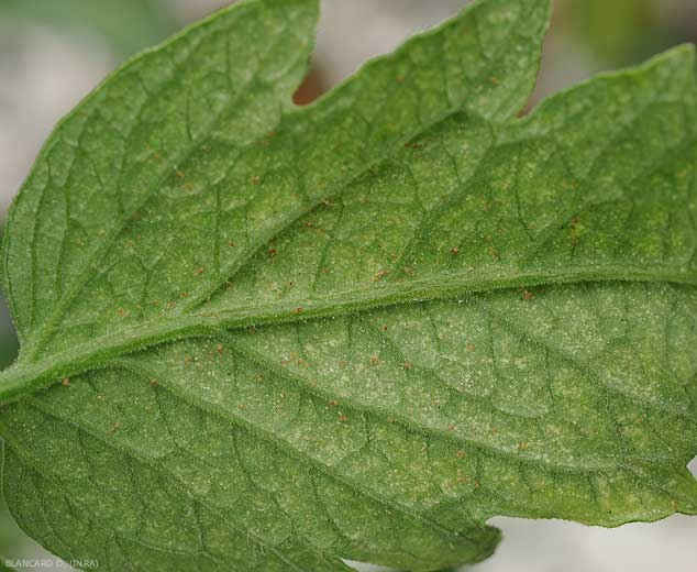 De minuscules taches chlorotiques plus ou moins dispersées apparaissent sur et sous le limbe des folioles de tomate (figures 1 à 5). Ce dernier jaunit progressivement et prend une teinte terne (figures 3). De telles taches sont aussi visibles sur la tige (figure 6) et les pétioles, mais aussi sur certains fruits (figure 7).