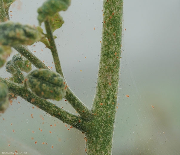 De délicates toiles soyeuses sont visibles au sein du couvert végétal sur les apex dont la croissance peut être bloquées,sur les feuilles et les fruits (figure 8).