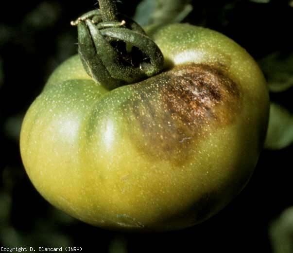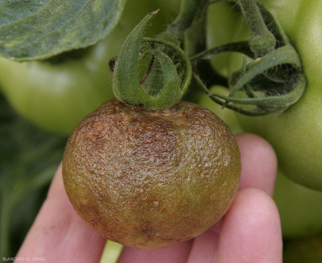 Les fruits atteints à un stade précoce présentent des marbrures brunes très caractéristiques (figures 10 à 13). Ils sont souvent bosselés. Dans ce cas, l'extension des marbrures est plutôt lente et leur marge irrégulière. Si les attaques surviennent plus tardivement, les plages marbrées sont plus homogènes et souvent réparties en cercles concentriques festonnés. Elles peuvent prêter à confusion avec celles occasionnées par d'autres Phytophthora, en particulier P. nicotianae.