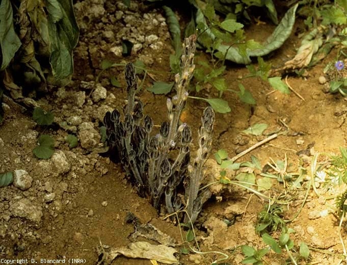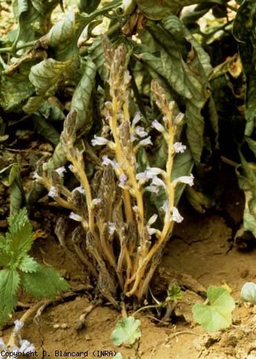 L'apparition de touffes colorées de blanc, de jaune ou de violet au pied des plantes caractérise le parasitisme des orobanches (figures 1 et 2). Ces touffes correspondent aux hampes florales qui peuvent avoir une hauteur d'une à plusieurs dizaines de centimètres. Ces hampes portent des fleurs bleu pâle à bleu violacé dans le cas d'O. ramosa, qui produiront des capsules contenant 300 à 500 graines chacune (graines mesurant de 0,2 à 0,4 mm de long).