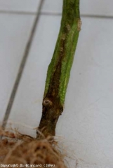 Avant de se développer sur le collet de la tomate, le Fusarium oxysporum f. sp. radicis-lycopersici (FORL) colonise plus ou moins entièrement les Racines, sur lesquelles il occasionne de nombreuses lésions brunes ainsi que leur pourriture (Fusarium crownand root rot). Par la suite, il gagne la base de la tige sur laquelle une lésion brune, humide et bien délimitée se développe progressivement (figure 1). Celle-ci est légèrement déprimée et peut s'étendre sur plusieurs dizaines de centimètres (figure 2). Il est à noter que le chancre au collet s'allonge en pointe vers le haut, donnant à la lésion la forme d'une flamme.