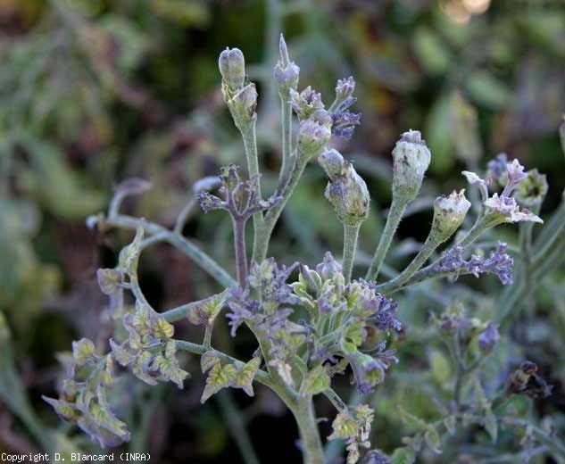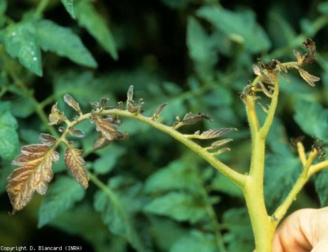 Les phytoplasmes s'attaquant à la tomate provoquent divers symptômes sur les organes aériens, jeunes et en croissance, de cette solanacée. En France, ils apparaissent souvent durant le mois de juillet, voire début août. À partir de cette période, la croissance des plantes affectées est souvent ralentie. Les apex forment des entre-noeuds plus courts et des feuilles plus petites, parfois enroulées. Les tissus du limbe sont souvent plus épais, voire cassants (figures 1 à 3).