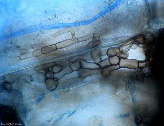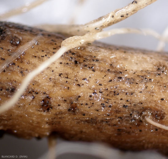 Les modalités de pénétration dans la racine sont assez comparables puisque des appressoria se forment à son contact. Notons que la colonisation des racines augmente avec leur âge. De plus, les sclérotes et par la suite le mycélium entrant en contact avec les fruits et les racines peuvent aussi entraîner des infections. Une fois en place, le champignon colonise les tissus sous-cuticulaires ou du cortex par l'intermédiaire de son mycélium (figure 4), et exerce son parasitisme par l'intermédiaire d'une protéase extracellulaire. L'infection peut aussi rester bloquée. Dans ce dernier cas, on parlera d'« infection latente ». Ce type de situation peut survenir aussi bien sur les fruits verts, les racines et même la tige. Les fruits verts voient cette latence levée à maturité ou s'ils subissent des températures basses.