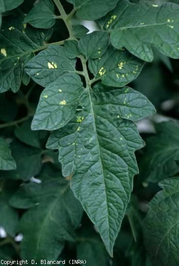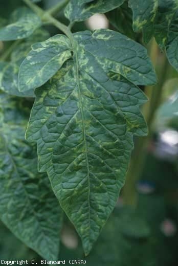Le Pepino mosaic virus (PepMV) provoque sur tomate une multitude de symptômes, parfois surprenants dans leur apparence et leur expression dans le temps. On peut observer des mosaïques foliaires plus ou moins sévères, parfois assez jaunes (figures 1 et 2), des taches, voire des plages chlorotiques assez marquées (figures 3 et 4) et des lésions nécrotiques (figure 5). Les taches jaunes constituent le symptôme le plus caractéristique de cette virose. Des déformations des folioles et des feuilles, sont aussi constatées en période de faible luminosité ; celles-ci peuvent s'incurver vers le haut ou le bas du limbe, et présenter des boursouflures et des énations vert foncé. Les apex des plantes voient leur croissance peu ou prou bloquée ; les folioles et les feuilles sont plutôt de couleur sombre, plus étroites et découpées. Ces symptômes leur confèrent l'apparence caractéristique de feuilles d'ortie ou de dégâts liés à des herbicides de type hormone. Par ailleurs, des stries brunes et liégeuses peuvent apparaître sur la tige.