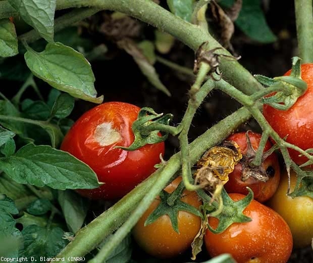 Lésions humides et molles s'étendant rapidement sur les fruits matures essentiellement. Les tissus affectés se liquéfient et finissent par s'effondrer, la cuticule se fend (figure 1). Des écoulements de jus peuvent être constatés. Le mycélium du champignon envahit les tissus, qu'une moisissure blanchâtre à grisâtre recouvre (figures 2 et 3). Cette moisissure est constituée par le mycélium, les sporocystophores et les sporocystes de ce Zygomycète. À terme, de nombreuses fructifications assez aériennes, en « têtes d'épingle noires », se forment sur les tissus lésés (figures 4 et 5).
