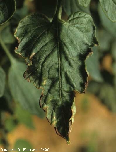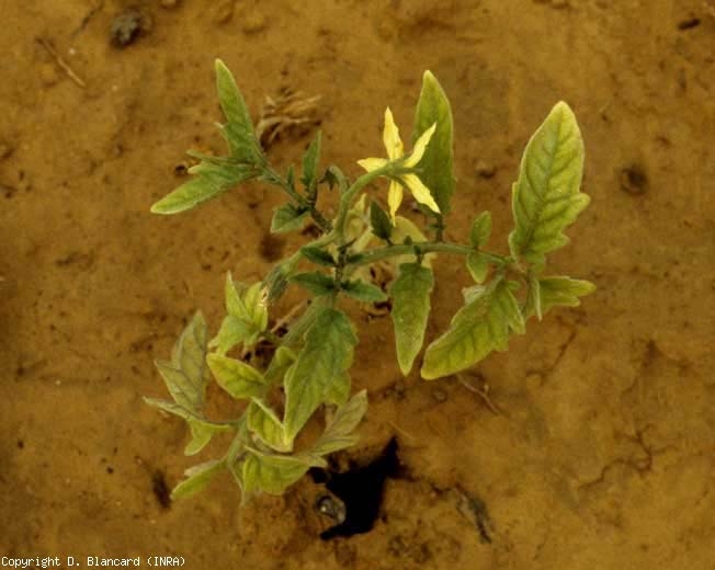 Bien que la tomate soit considérée comme relativement tolérante au sel, des dégâts liés à des excès (salt damage) peuvent être constatés dans certaines zones de production, notamment arides ou semi-arides. Les plantes affectées sont souvent de taille réduite et peu vigoureuses. Les folioles ont une teinte plus ou moins chlorotique (figure 2). Les feuilles basses sont particulièrement affectées : d'un jaune plus marqué, elles peuvent finir par tomber. Des différences de sensibilité entre cultivars peuvent être observées.