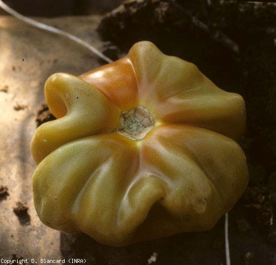 Fruits déformés, côtelés, angulaires, plus ou moins plats au niveau de la zone « équatoriale » (figure 1) (puffiness). Plusieurs facettes peuvent être observées, dont le nombre varie en fonction de celui des cavités loculaires présentes dans le fruit.