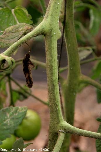 Ce miellat sucré est une véritable aubaine pour plusieurs champignons du phylloplan de la tomate qui l'utilisent pour se nourrir, et qui sont à l'origine de la fumagine (sooty mold). En effet, leur développement conduit à l'apparition progressive d'une à plusieurs moisissures sur le limbe (figures de 1 à 3), la tige (figure 4) et même les fruits (figures 5 et 6) ; elles présentent des teintes variables en fonction des espèces fongiques (Alternaria spp., Cladosporium spp., Capnodium sp., Penicillium sp., etc.).