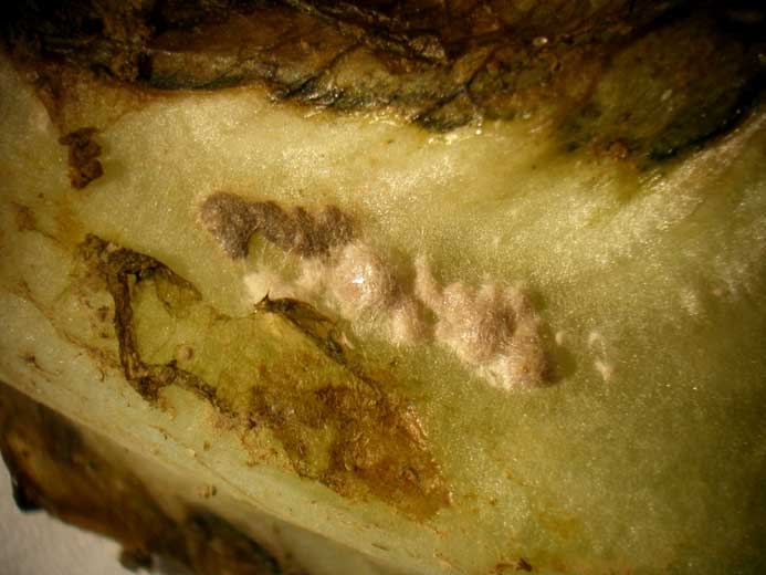 Sur ou à proximité des tissus altérés, on distingue parfois de discrets filaments blanchâtres à bruns (figures 3 et 7) cheminant le long de la tige, des nervures et d'une feuille à l'autre. Des masses mal définies, de couleur brune, sont quelquefois disposées le long des nervures (figure 8).