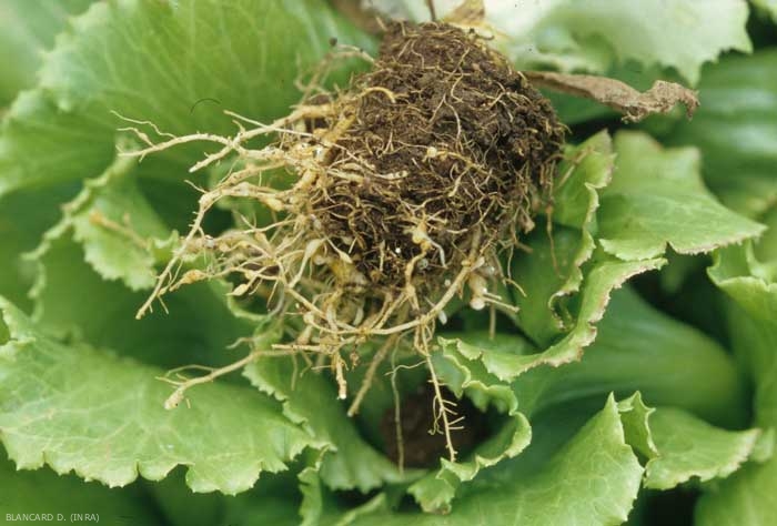 Ces altérations racinaires perturbent le développement des salades qui présentent une croissance réduite. De plus, certaines feuilles peuvent être chlorotiques et des flétrissements surviennent parfois aux heures les plus chaudes de la journée.