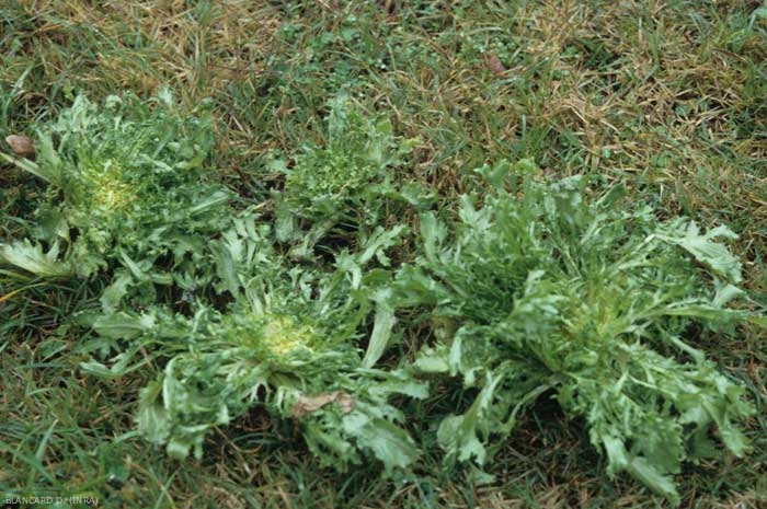 En France, bien que le champignon soit présent dans de nombreux sols, aucun dégât n'avait été observé sur salades. Mais, nous avons pu mettre en évidence Thielaviopsis basicola sur des chicorées frisées peu poussantes (figure 1), cultivées en plein champ dans les Pyrénées-Orientales. De nombreuses racines de ces plantes étaient brunes à noires (figures 2 et 5) ; les plus grosses d'entre elles présentaient des altérations et des manchons liégeux en surface.