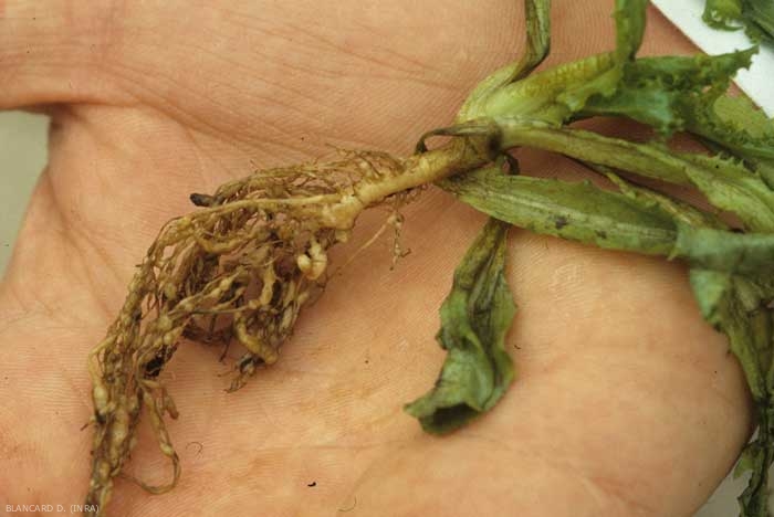 à l'extrémité des jeunes racines, présence de nécroses. Certaines racines peuvent être fourchues et plus courtes. Les plantes affectées ont souvent une croissance réduite.