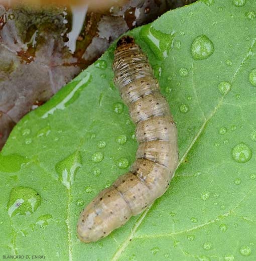 Chenilles de 3,5 cm de long, charnues, de couleur variable, grisâtres à verdâtres, surmontées de taches ou de bandes foncées (figures 4 à 7). |