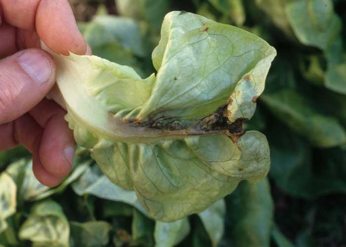 Toutes les feuilles ne sont pas forcément touchées. Dans un premier temps, les lésions sont plutôt réparties à la périphérie du limbe. Cette bactérie opportuniste s'installe aisément sur les tissus atteints de "Tip burn" (consulter le lien Nécroses marginales). Elle n'entraîne une pourriture de la moelle que durant des périodes de temps couvert et humide et sur certaines variétés de laitue.