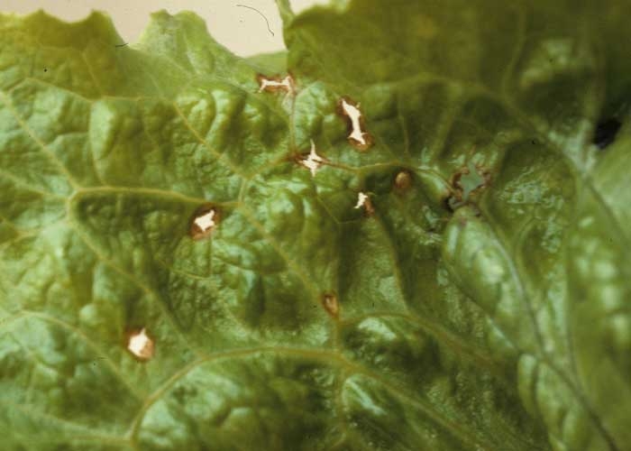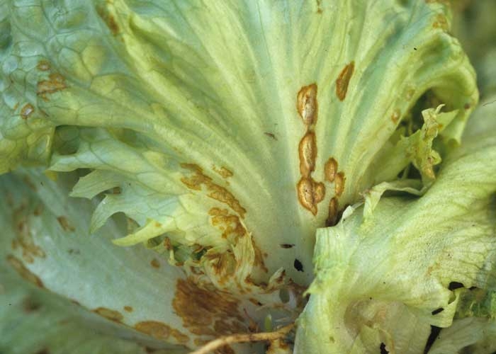 Il n'est pas rare d'observer, au cours d'automnes pluvieux et frais et durant l'hiver, de nombreuses taches sur les feuilles basses des salades, dues à la présence de Microdochium panattonianum (figure 1). En les détaillant de plus près, on constate qu'elles sont dans un premier temps de petites dimensions, humides et de forme arrondie. Elles chlorosent assez rapidement et prennent une teinte orangée avant de brunir. Elles mesurent à terme 3 à 5 mm de diamètre (figures 2 et 3). Elles sont parfois plus ou moins angulaires lorsqu'elles sont délimitées par les nervures. Les tissus brunissent assez vite, se nécrosent et tombent. Le limbe présente alors de nombreuses perforations conférant aux feuilles un aspect criblé très caractéristique (figure 4). Sur les côtes, les taches sont plus allongées et concaves, leur couleur est souvent plus sombre (figure 5). En présence d'une forte humidité ambiante, de très discrètes masses de spores roses (les acervules du champignon couvertes de conidies) se forment sur le pourtour des lésions (figure 6). Les feuilles fortement affectées ne tardent pas à s'étioler et à se nécroser totalement.
