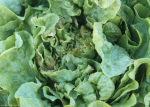 Pour observer cette problématique sur salades à pomme « fermée » il est nécessaire de couper celle-ci. Elle se manifeste plutôt à l’approche de la maturité des salades. A ce stade, les feuilles du cœur protégées par celles de la couronne, et donc moins aérées, sont plus humides.