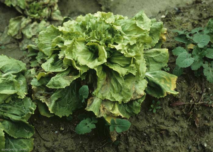 Les salades sont relativement tolérantes aux basses températures. Malgré cela, des dégâts surviennent parfois en fin de nuit, en présence de températures comprises entre approximativement 0 et -1°C. On constate le plus souvent des décollements de l'épiderme des feuilles consécutifs à la formation de glace sous les cellules de ce tissu (voir le lien Dégâts dus au gel). Si les températures sont plus basses, tous les tissus seront affectés. Les salades pourront apparaître comme échaudées lors du dégel. Elles auront dans ce cas un port flasque donnant l'impression de flétrir (figure 1).