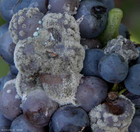 Nous insistons sur le fait que ces champignons sont fréquents dans certaines régions de production, mais qu'ils passent souvent inaperçus au coeur des grappes botrytisées. L'ouverture de plusieurs grappes permet plus facilement d'apprécier le phénomène. De plus, soulignons aussi l'association forte mise en évidence au vignoble entre la présence de géosmine au coeur des grappes, le développement plus ou moins important de B. cinerea sur celles-ci, et l'envahissement secondaire de ces dernières par des Penicillium spp.*, et notamment par P. expansum.