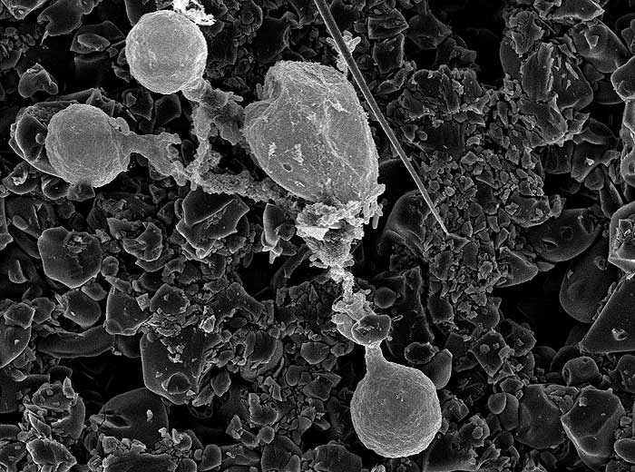 - Les oospores (figures 2 à 4) matérialisent sa forme sexuée (téléomorphe) et assurent sa conservation hivernale dans les tissus foliaires. De couleur jaune, elles mesurent entre 25 et 40 µm de diamètre. Elles germent au printemps et donnent naissance à une macroconidie (figure 3) se formant à l'extrémité d'un filament mycélien. Plutôt piriforme, cette macroconidie mesure 23-27 x 30-41 µm et produit plusieurs dizaines de zoospores piriformes à ovoïdes (figure 4), mesurant 4-5 x 6-10 µm, et mobiles grâce à deux flagelles.