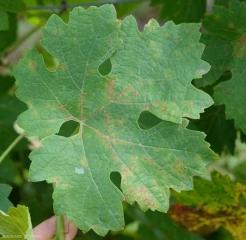 - des taches plus ou moins circulaires et étendues, d'abord translucides à huileuses, jaunissant assez rapidement, puis se nécrosant (plutôt sur jeunes feuilles)(figures 1 à 3). Un duvet blanc plus ou moins dense se forme à la face inférieure de ces taches (figures 4 et 5) ; il est constitué par les sporangiophores et les sporanges de P. viticola. Mesurant jusqu'à 1 cm et parfois confluentes, ces taches peuvent couvrir la quasi-totalité du limbe et entraîner le dessèchement des feuilles et leur chute, les ceps devenant fortement effeuillés (figure 10) ;