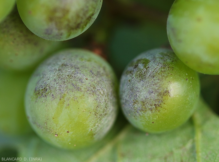La gravité des attaques d'oïdium sur baies est très dépendante de l'intensité et de la précocité des infections survenant à partir de la floraison. Ajoutons que le développement d'E. necator se réduit progressivement au fur et à mesure que la teneur en sucre et en anthocyanes des baies augmente.