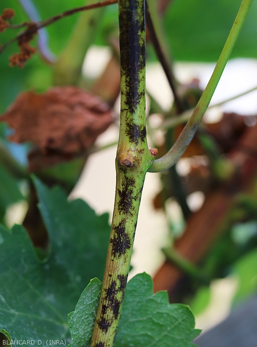 Les jeunes rameaux sont également colonisés par E. necator. Couverts par son mycélium, ils présentent des taches, voire des plages irrégulières et mal définies plus ou moins poudreuses. L'aoûtement des rameaux oïdiés est souvent partiel et à l'automne, les zones affectées par E. necator prennent une teinte brunâtre à noirâtre toujours visible durant l'hiver (figures 7 et 8).